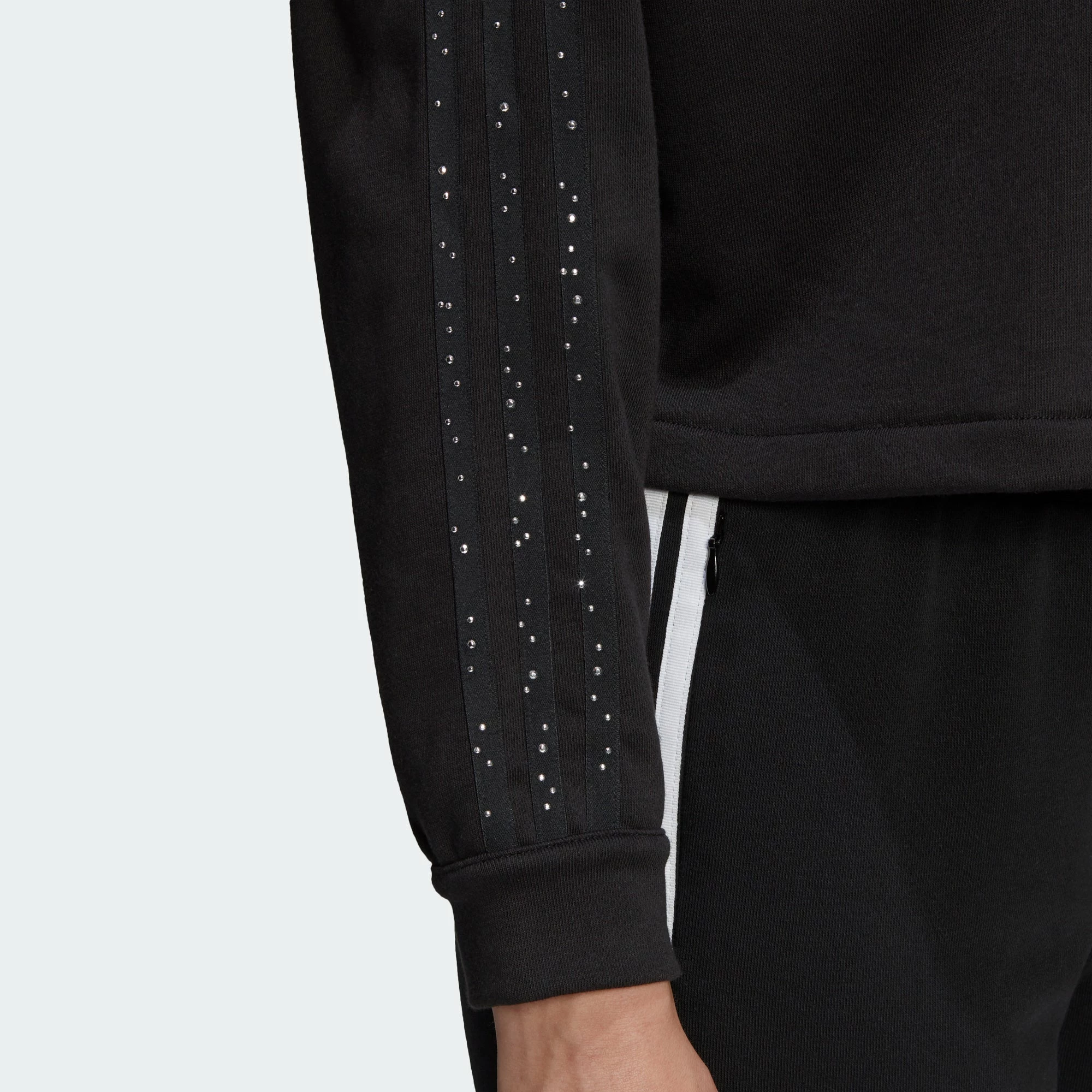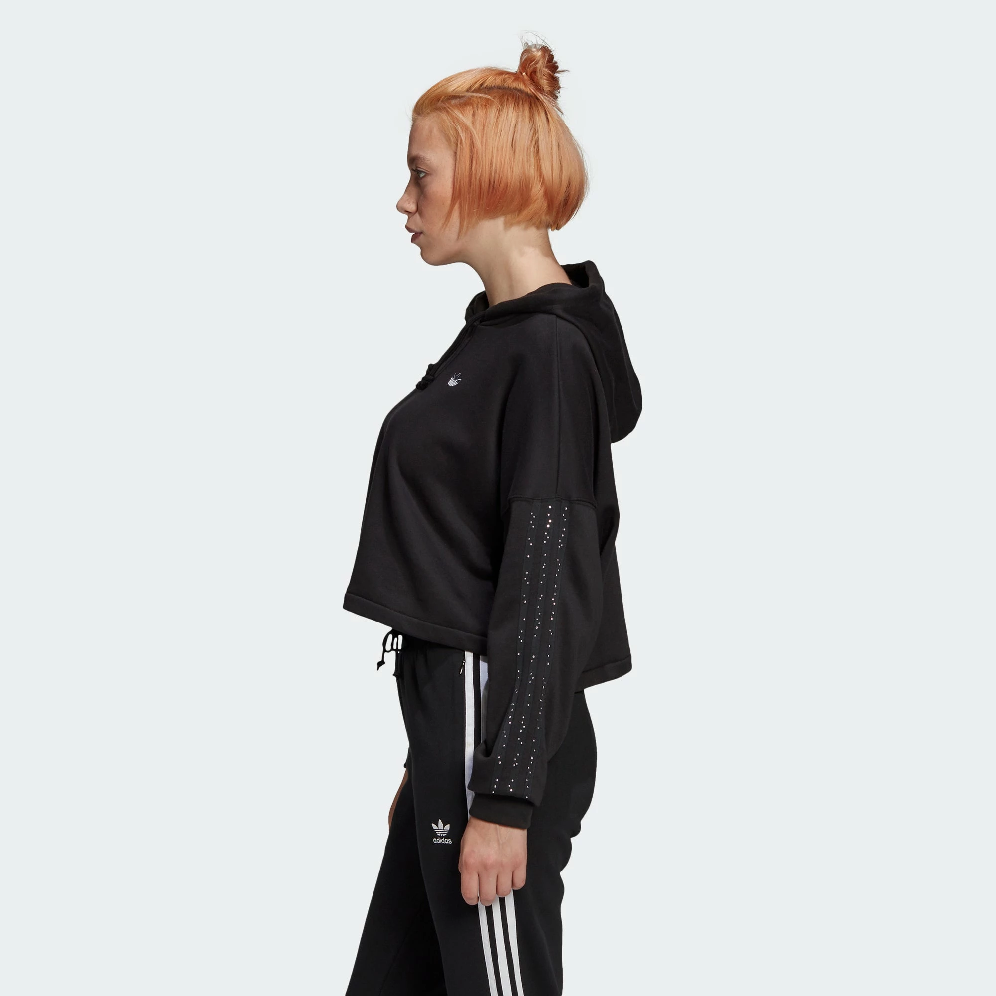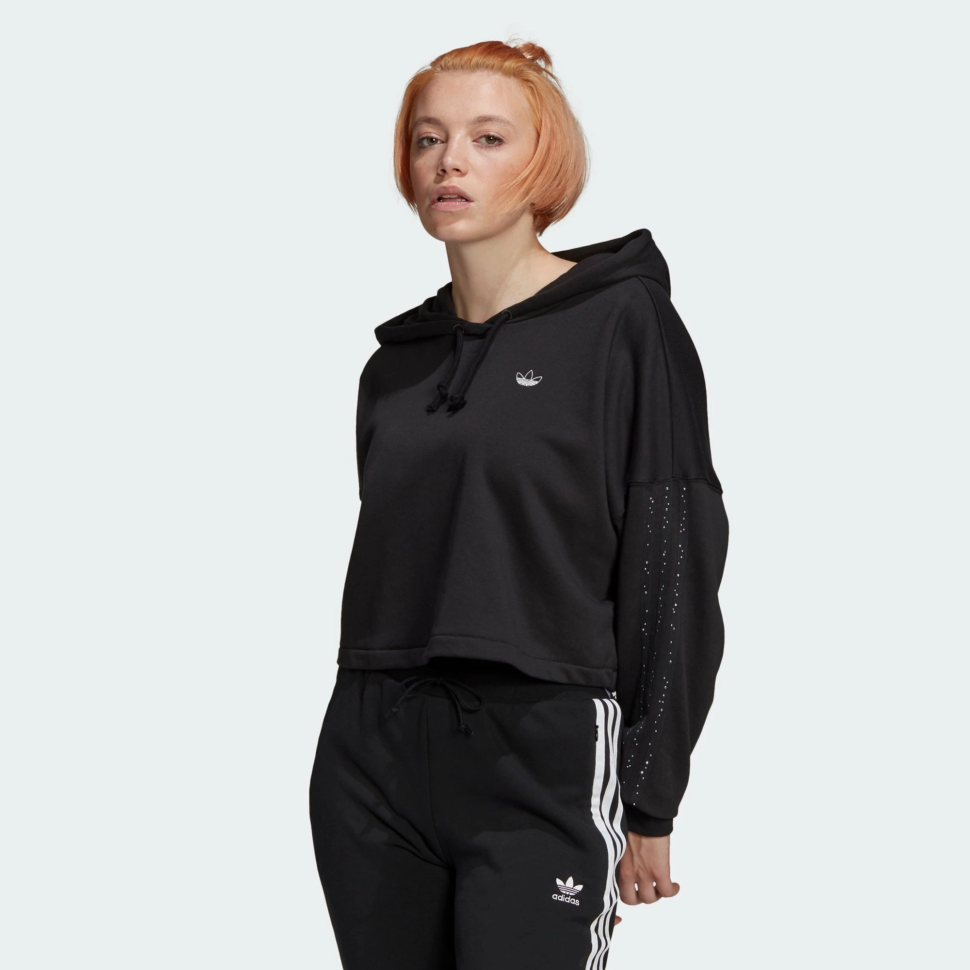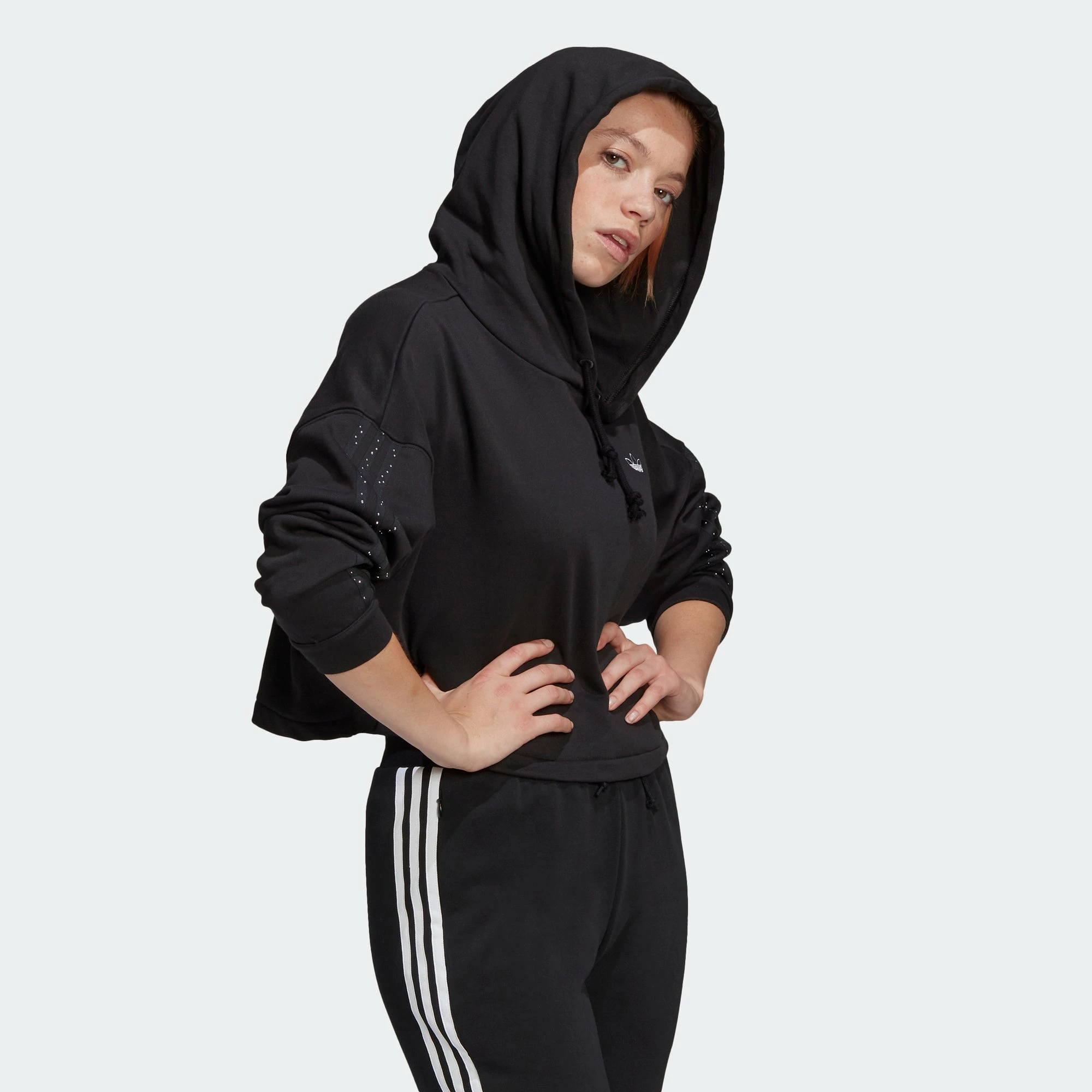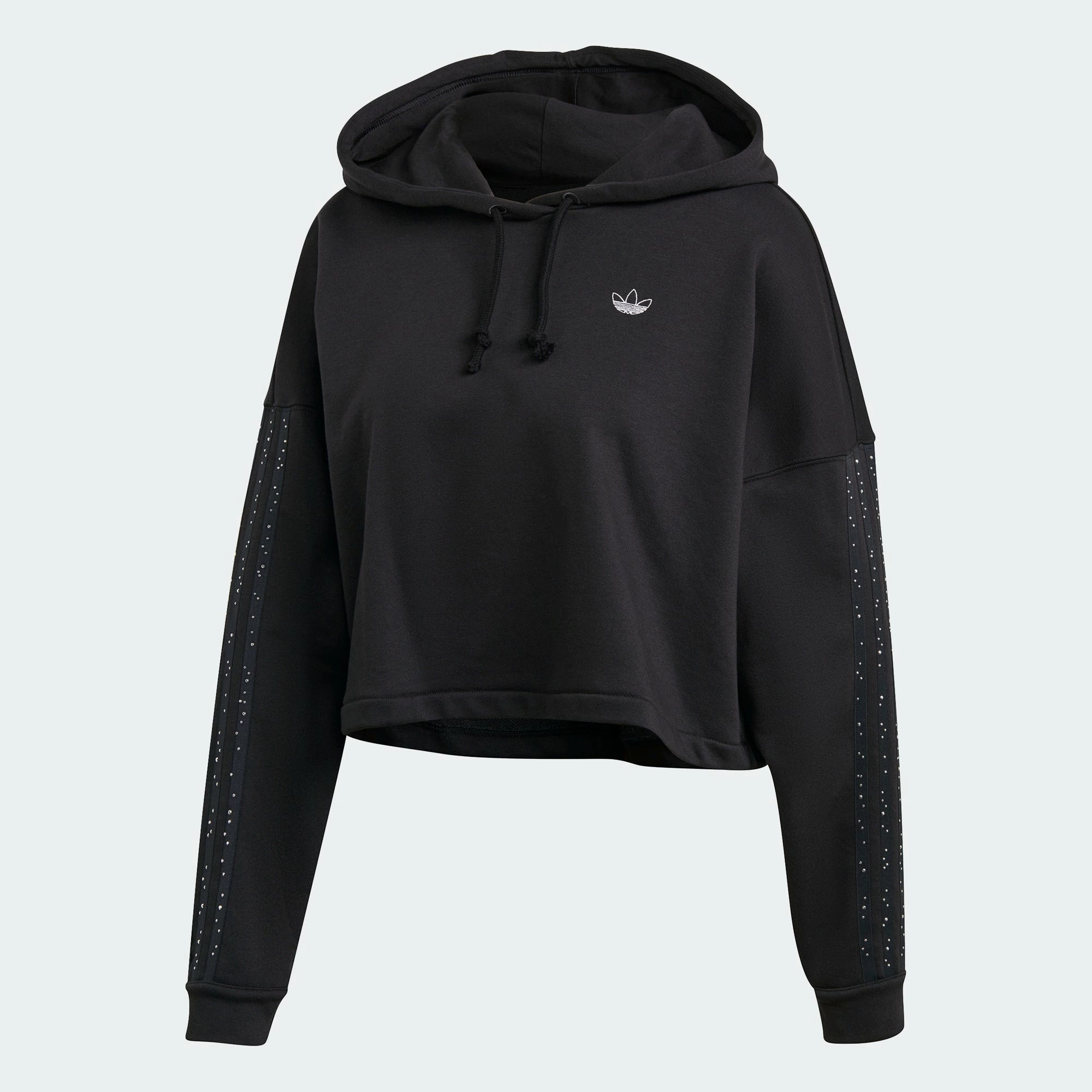 Keep it casual and laid back with the adidas Fakten Cropped Hoodie. The cropped hooded sweatshirt is designed to fit loose with a casual drape. adidas 3-Stripes run down the sleeves with a touch of whimsy in the form of raindrops. The hoodie comes in black with white details.