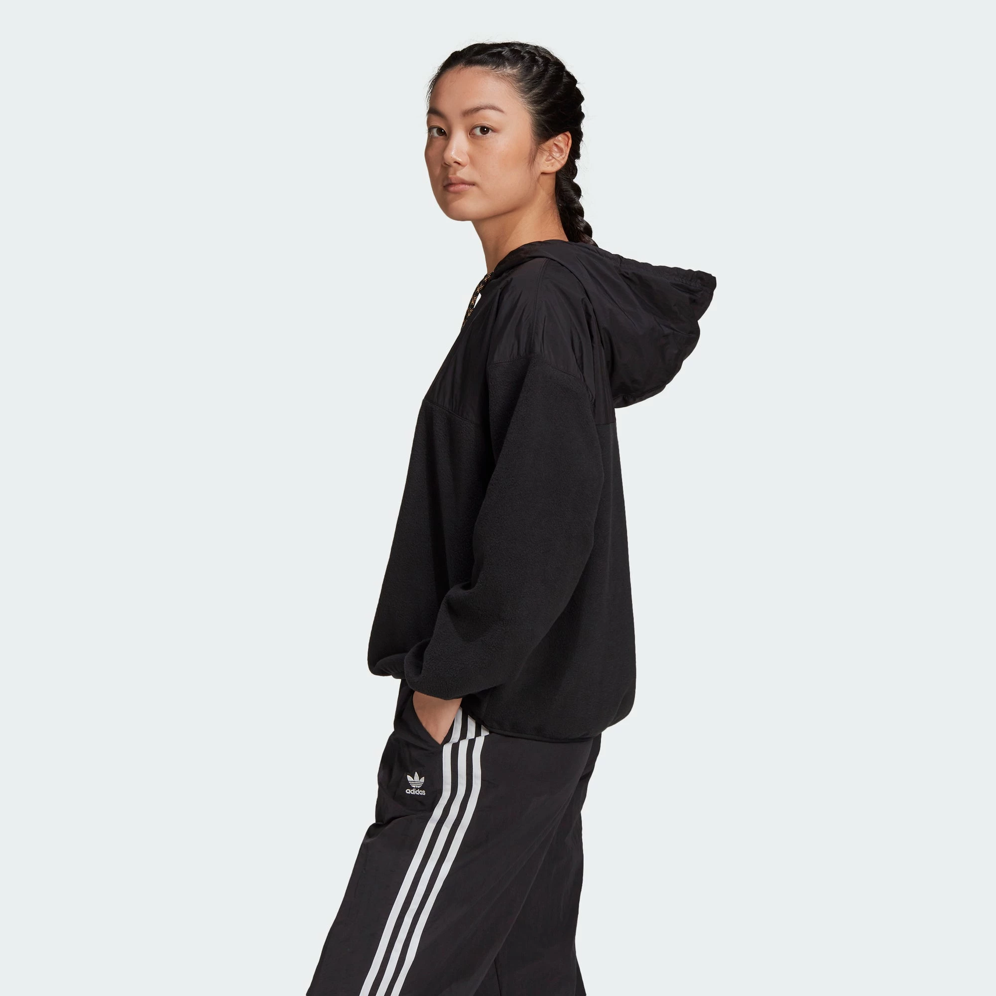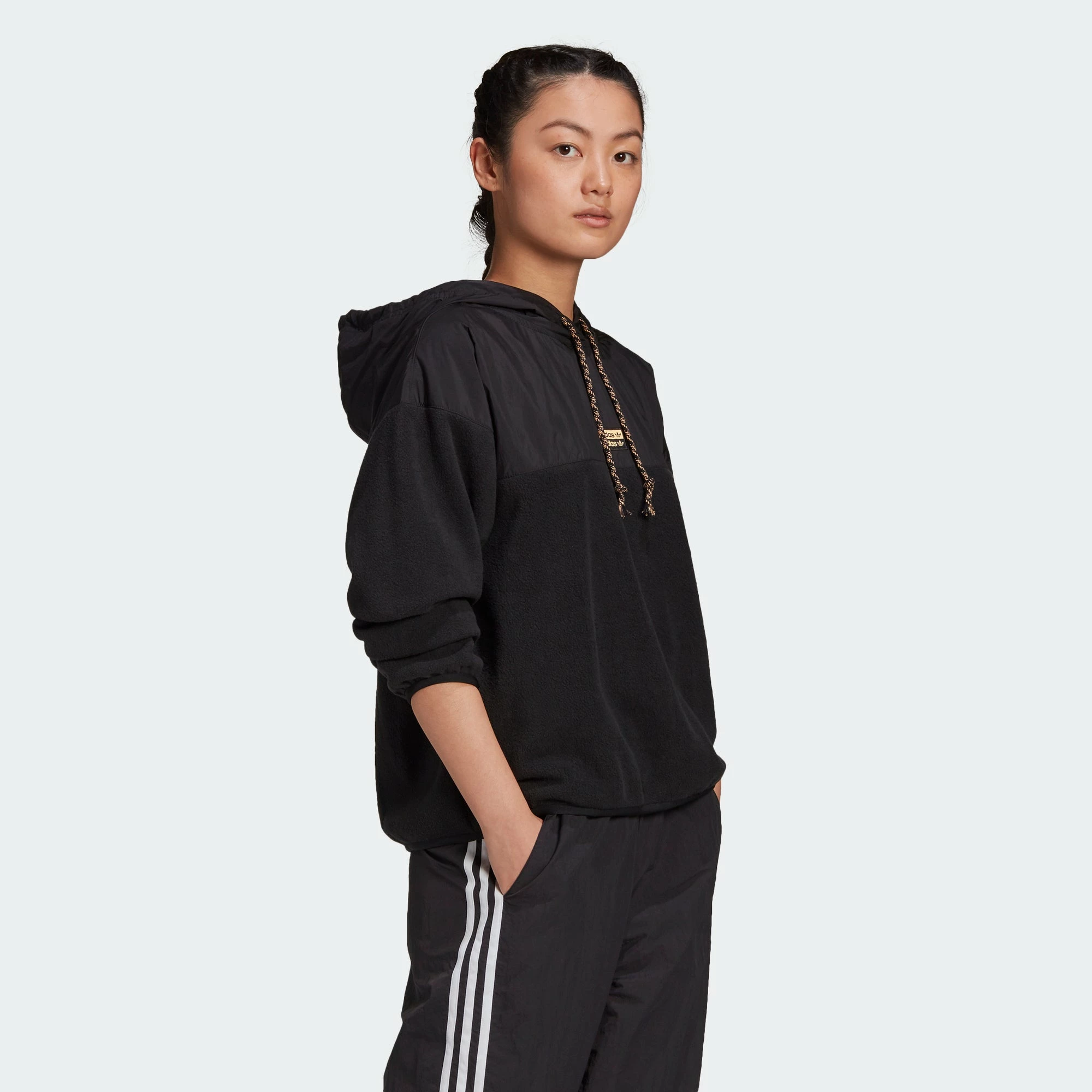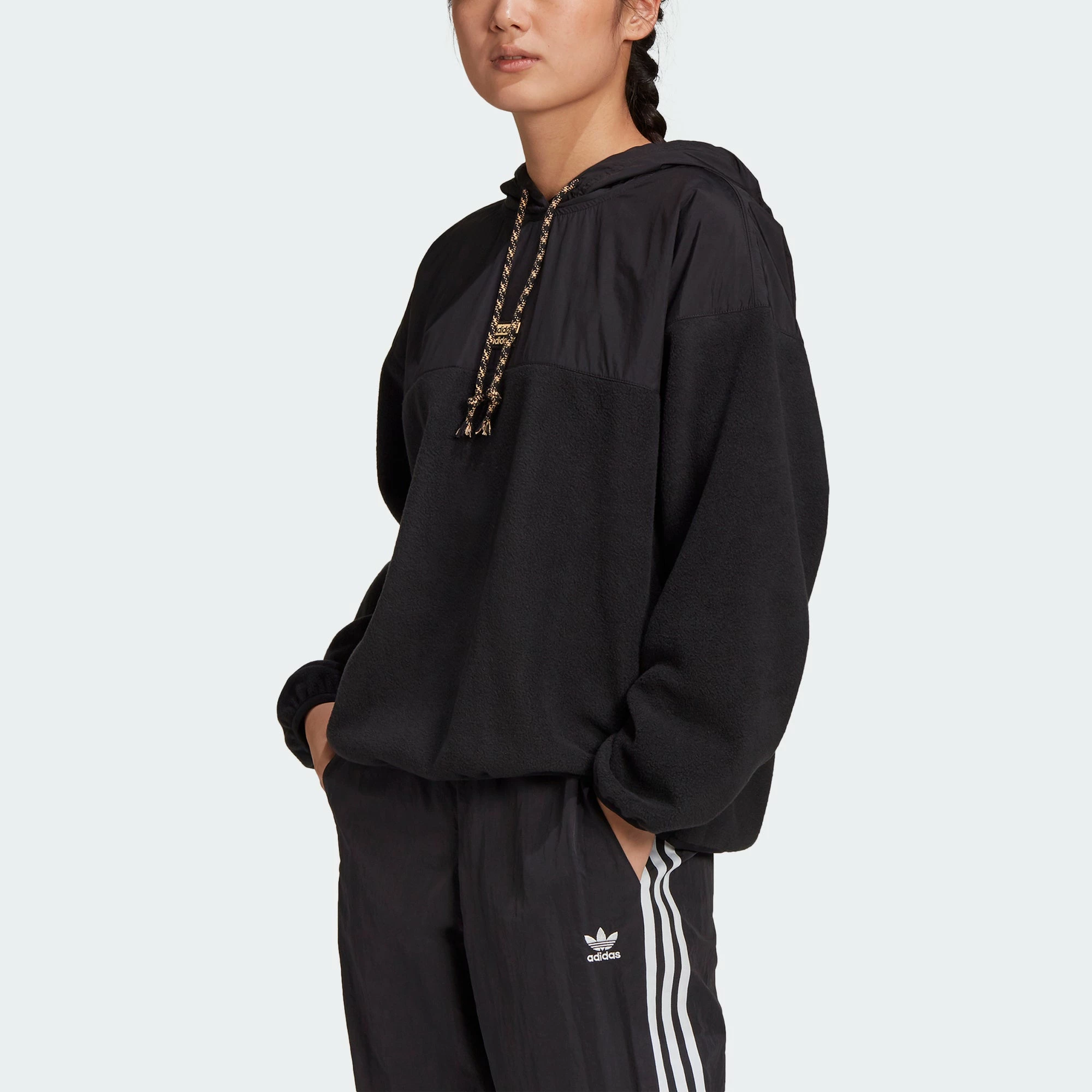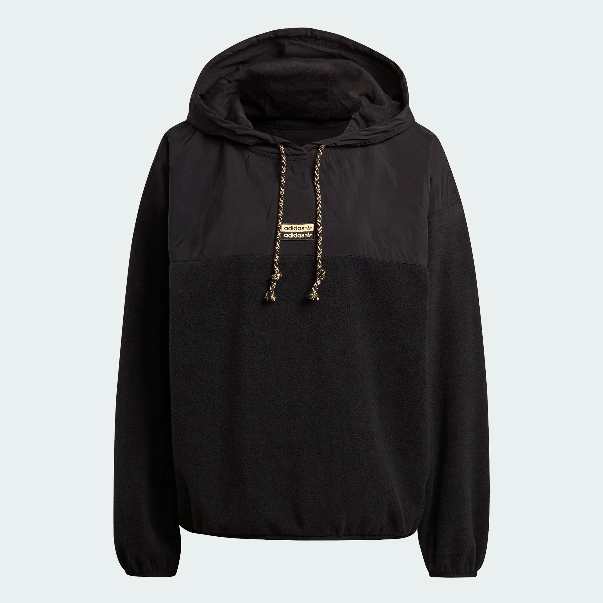 Reveal. Your Voice. The adidas R.Y.V. Hoodie is made of super warm fleece with a hood, elastic cuffs and hem to block out the elements. In a loose fit, stay comfy and cozy all day long. Comes in black with the adidas double linear Trefoil logo on the chest.