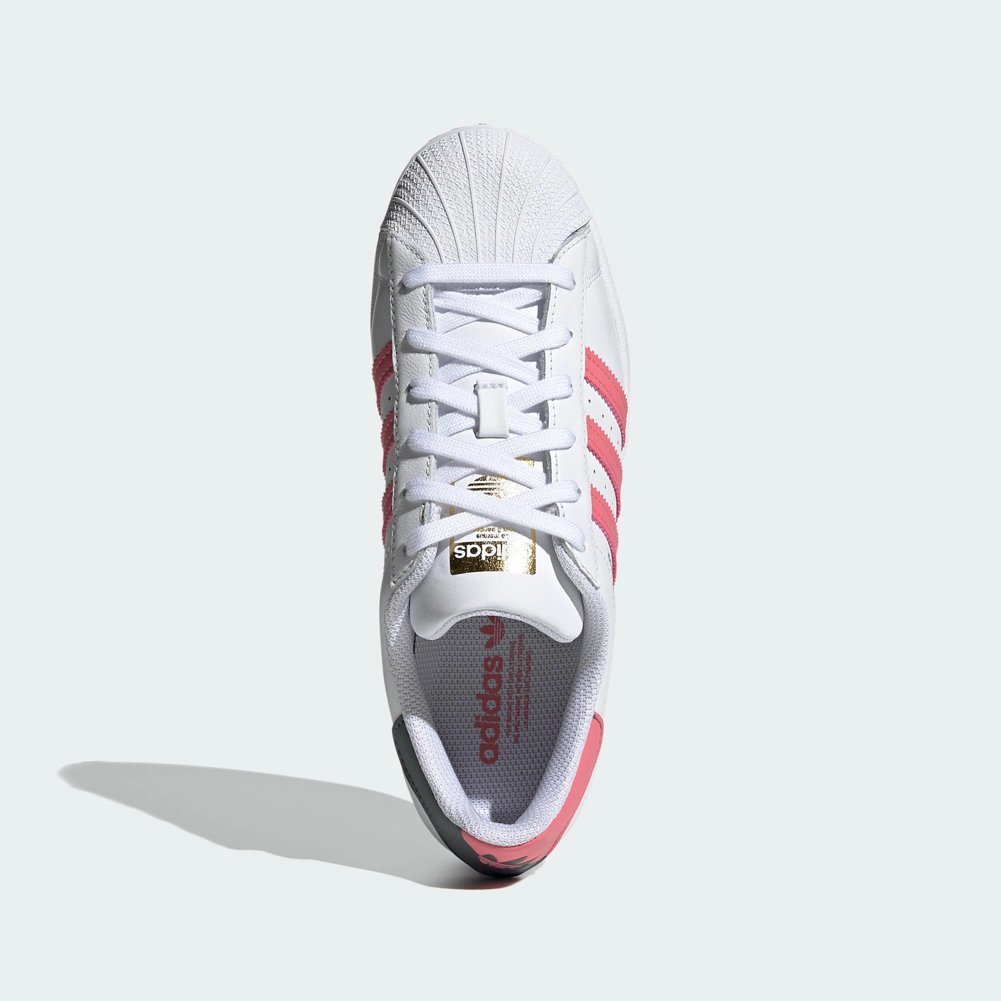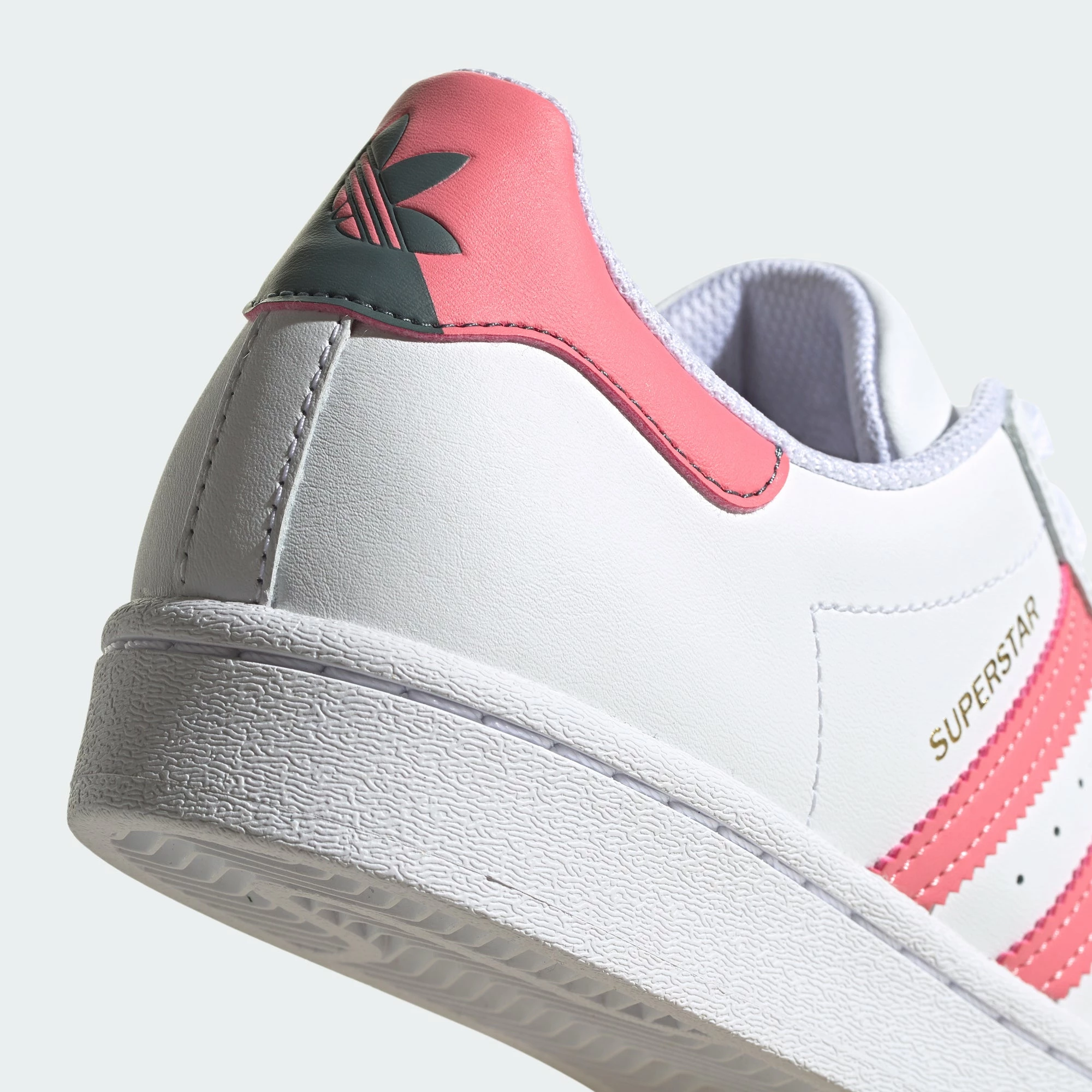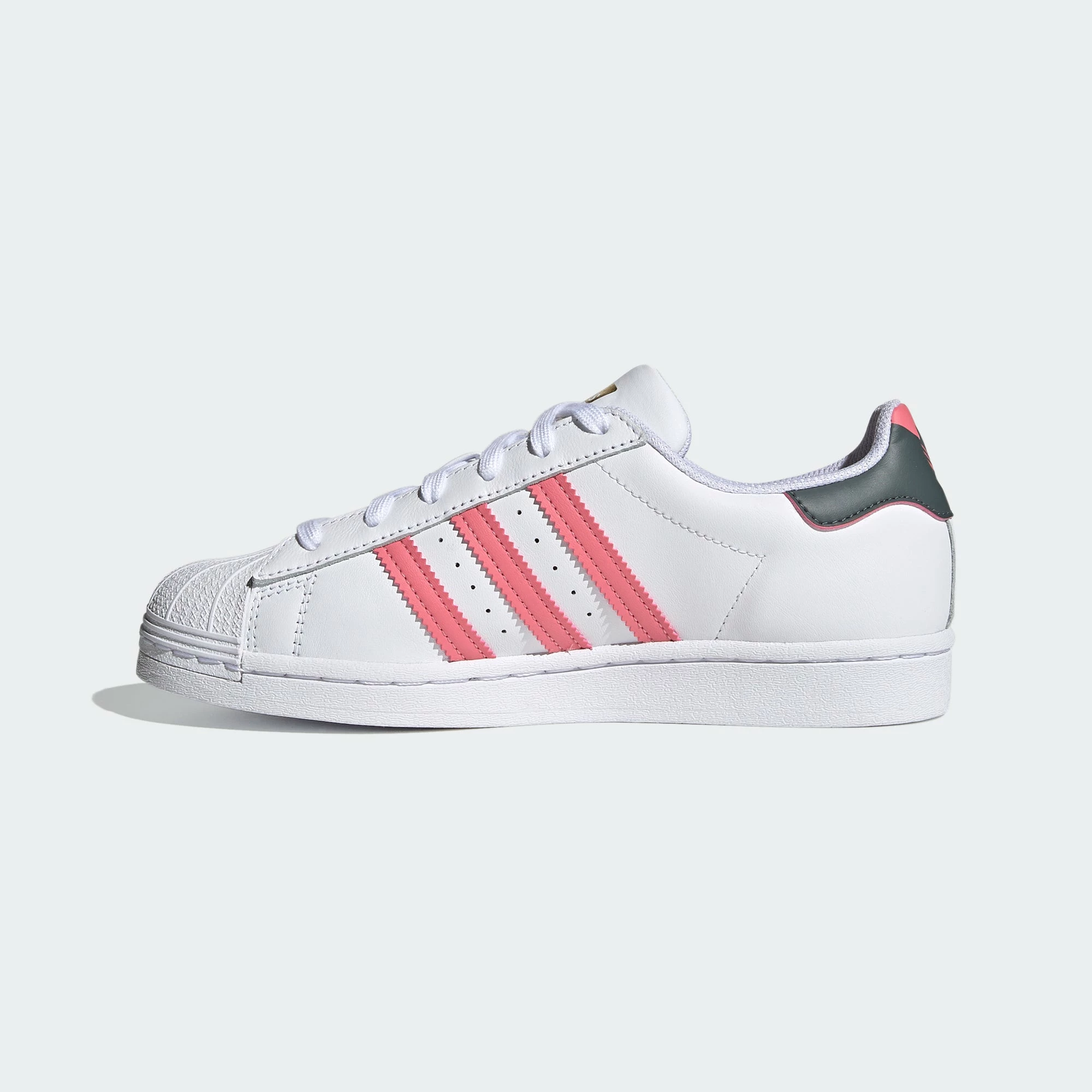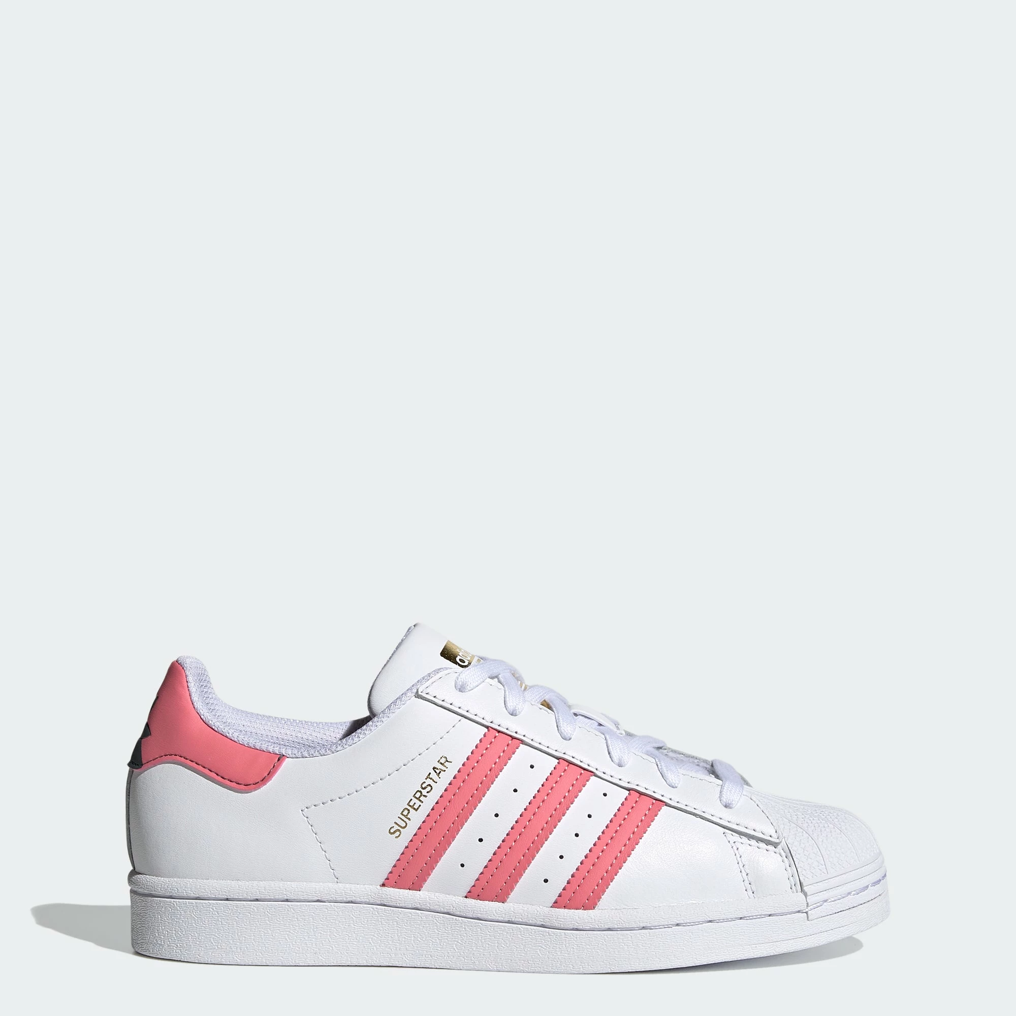 Freshen up your Superstar game with a pair that’s classic, yet bold. The adidas Superstars started on the basketball court and have graced the feet of generations both on and off the court. An iconic favorite that still reigns supreme. This season, the adidas Superstars come in a white backdrop with pink 3-Stripes, dual-colored Trefoil design on the heel tab with hits of gold on the tongue. The Superstars remain unmistakably adidas with the serrated 3-Stripes and shell toe.
