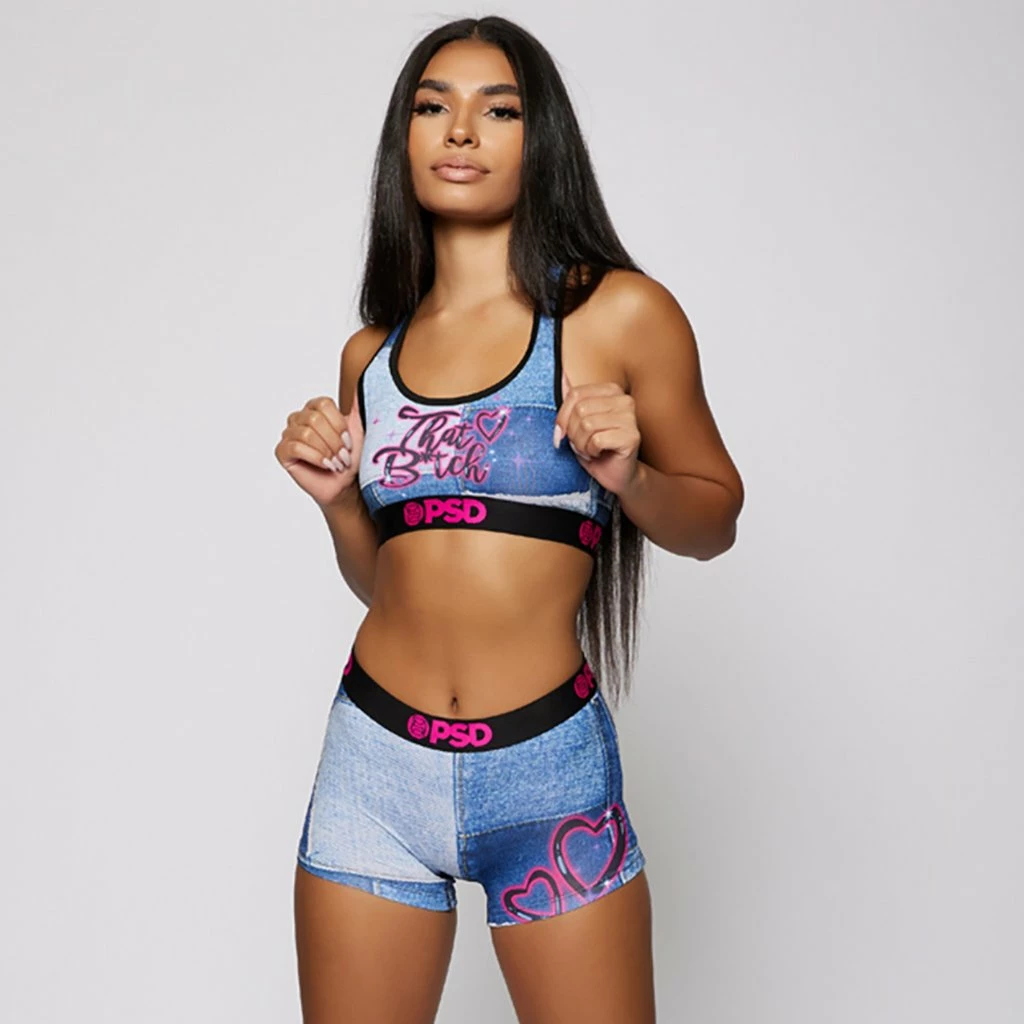 Sweet and sassy is the sports bra. Add to your collection of undergarments with colorful PSD sports bras. The sports bras are made of 4-way stretch mesh fabric that’s ultralight, super soft and super comfy. You’ll stay cool and fresh all day long. The soft and flexible microfiber waistband is made with moisture-wicking properties and contours your waistline. Whether you live a physically active lifestyle, or are just chill and like to lounge, do it in style from the inside out. Graphics of denim sit in the background with a sassy That B*tch saying across the back of the boy shorts for a playful look.