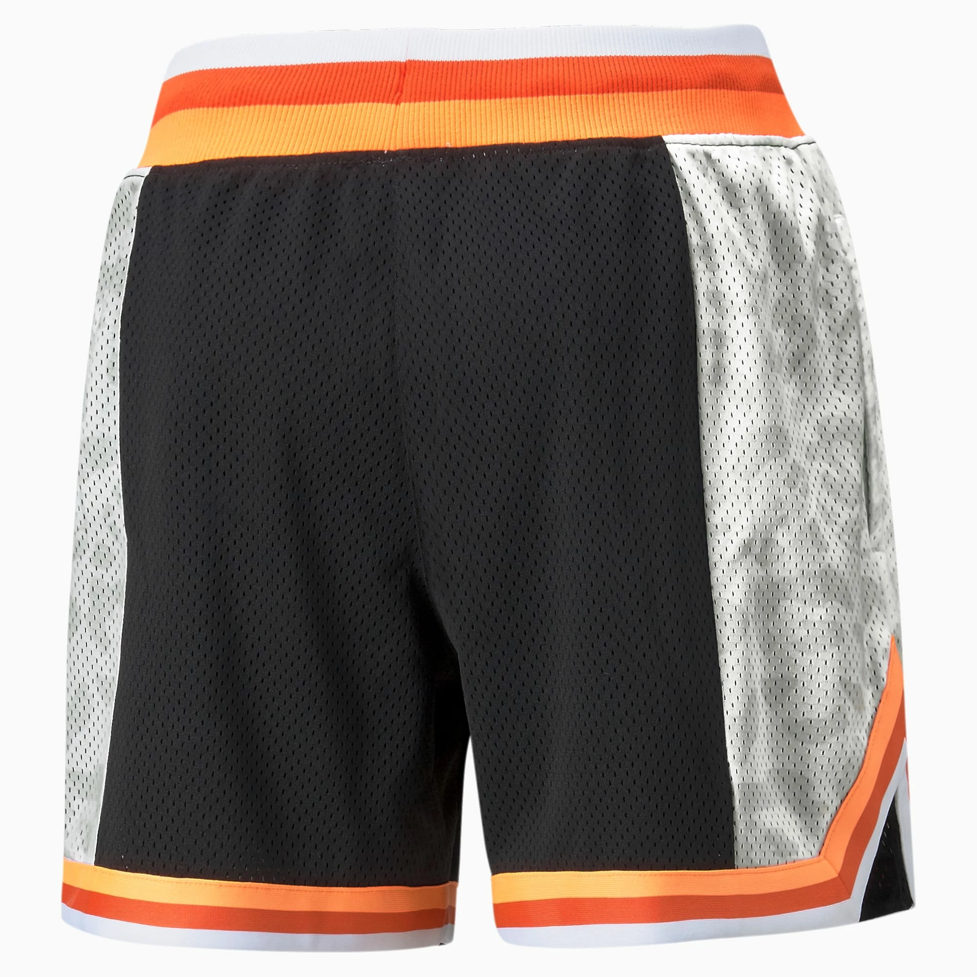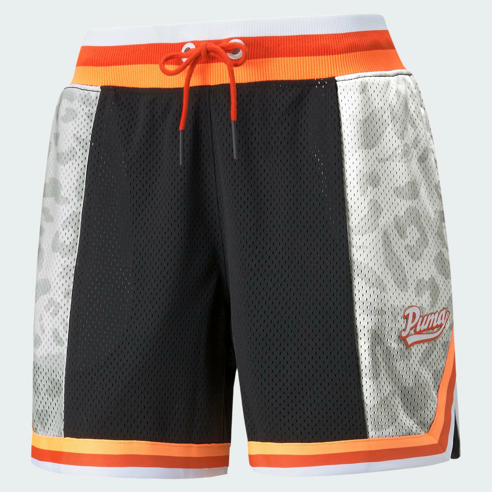 Shoot some hoops with the PUMA Swish Maker Printed Basketball Shorts. The lightweight mesh shorts feature eye-catching colorblocks and allover print design. Gives off a vintage vibe with the retro PUMA logo. Comes with pockets on the sides and drawcord to adjust the waist just right.